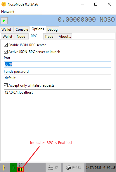 To set up a Noso RPC node, you must first download and install NosoNode software from the Noso Project Github repository [(here)](https://github.com/Noso-Project/NosoNode). Once NosoNode software is installed, navigate to the <mark style="color:red;">**“Options > RPC” tab**</mark>. From the <mark style="color:red;">**RPC tab, specify your RPC TCP port (Default 8078) and check the box “Enable JSON-RPC server”**</mark>. You will see the word RPC in yellow at the bottom indicating RPC is enabled. It is highly recommended to whitelist the IP addresses of specific servers allowed to connect especially when hosted publicly.